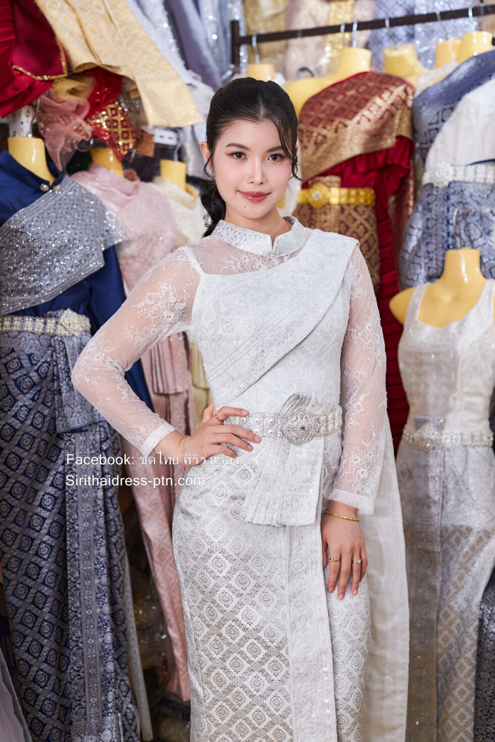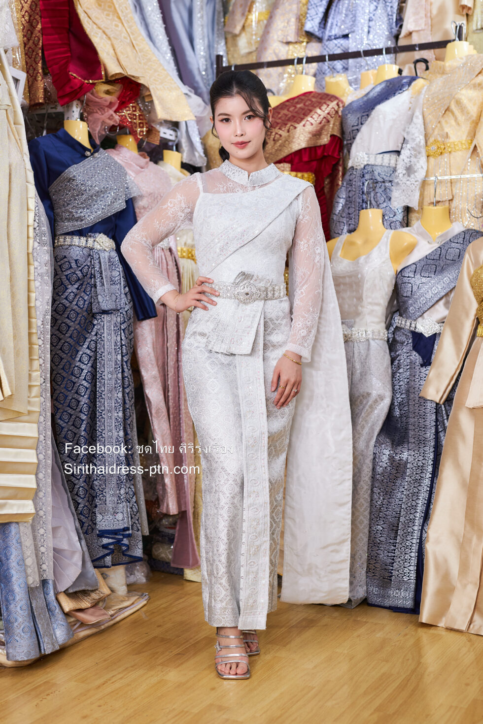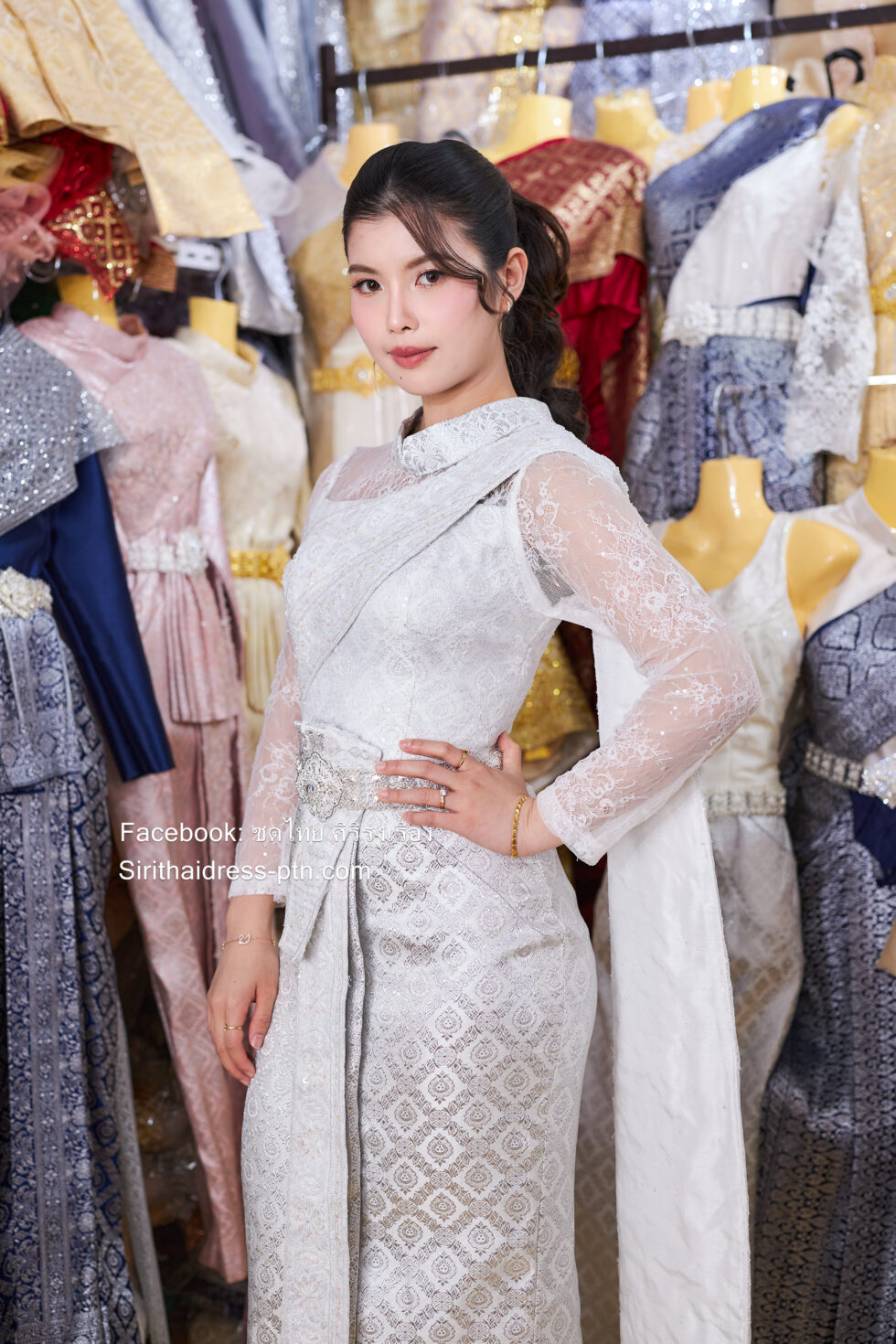ชุดไทยศิวาลัยแขนซีทรูสีขาวเงิน