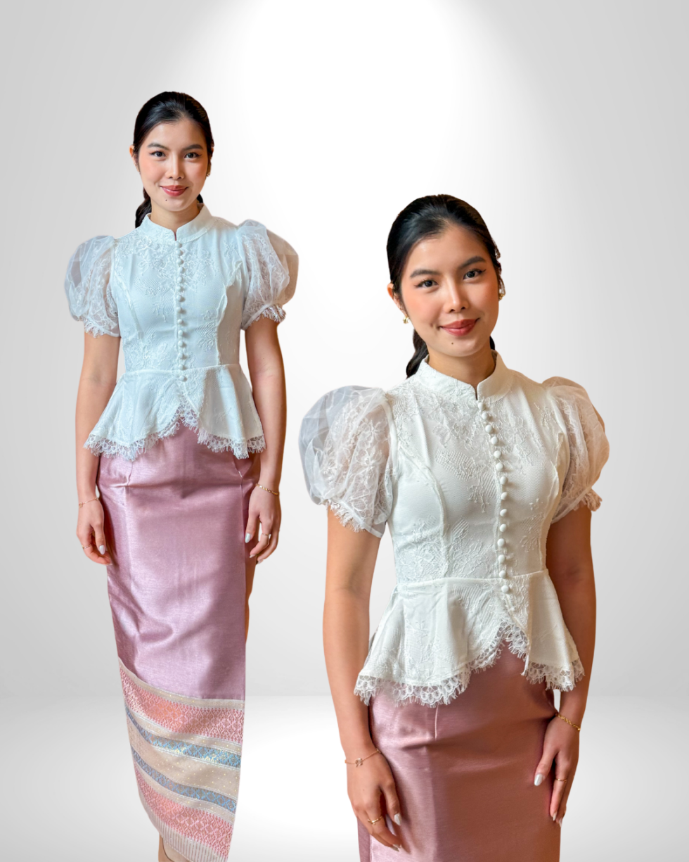 เสื้อลูกไม้ งานตัด ทรงดี ไม่โหล ลูกไม้ไม่คัน และผ้าถุงสำเร็จรีดกาวทั้งตัว ลูกค้าสามารถ เลือกผ้าถุงเองได้ มีทุกขนาดค่า เหมาะสำหรับใส่ไปทำบุญ และไปวัด