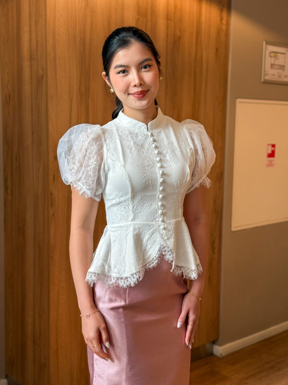 เสื้อลูกไม้แขนตุ๊กตาสีขาว